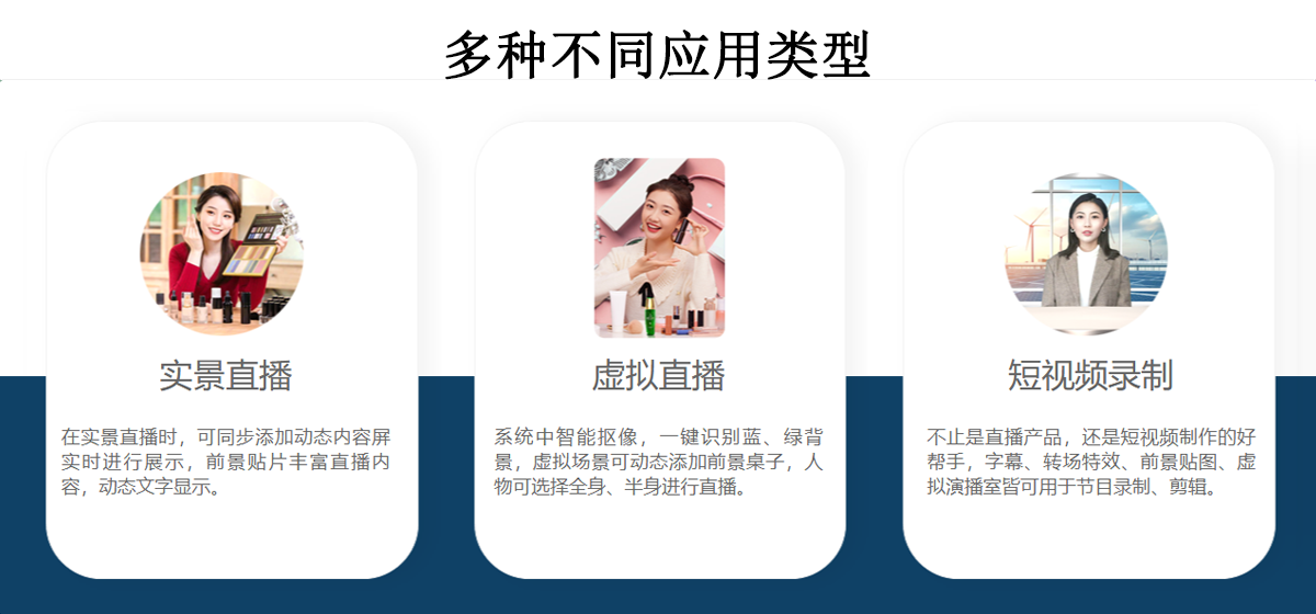 绣歌直播软件主要应用于直播和短视频制作。在直播领域,适用于直播带货、娱乐直播、直播教学等应用。绣歌直播软件基于广电虚拟演播室技术开发而来,通过色键抠像将人物与虚拟背景渲染出我们想打造的直播环境。优势在于无需实景装修、喷绘装饰、系统界面简单易操作,即学即会.系统带有专业展示带货产品的特写与详情画中画。支持美颜、支持主流直播平台无缝对接。