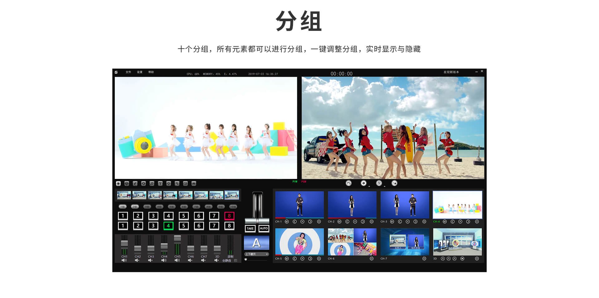 绣歌G-TV1038演播室是绣歌软件在2019年推出的新产品,性能强大,新增信号源自由选择,高质量抠像技术,支持一路实时渲染,三路抠像,八路导播,内置导播切换台、转场特效,画中画、多路推流、多窗口组合、网络流媒体等功能,通过扫描二维码可以实现手机操作软件导播切换,简单方便。